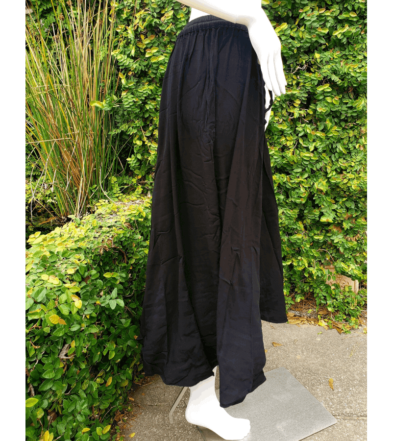Featuring a distinctive upward angle cut along the inside, our Alli Pants offer a unique and fashionable look that sets them apart from the crowd. The dropped crotch pants are available in all colors of bamboo rayon. They have a drawstring waist. The lightweight material makes for easy layering, or breezy warm weather bottoms. The elevated cut adds a touch of elegance to your outfit, ensuring you stand out with every step you take.